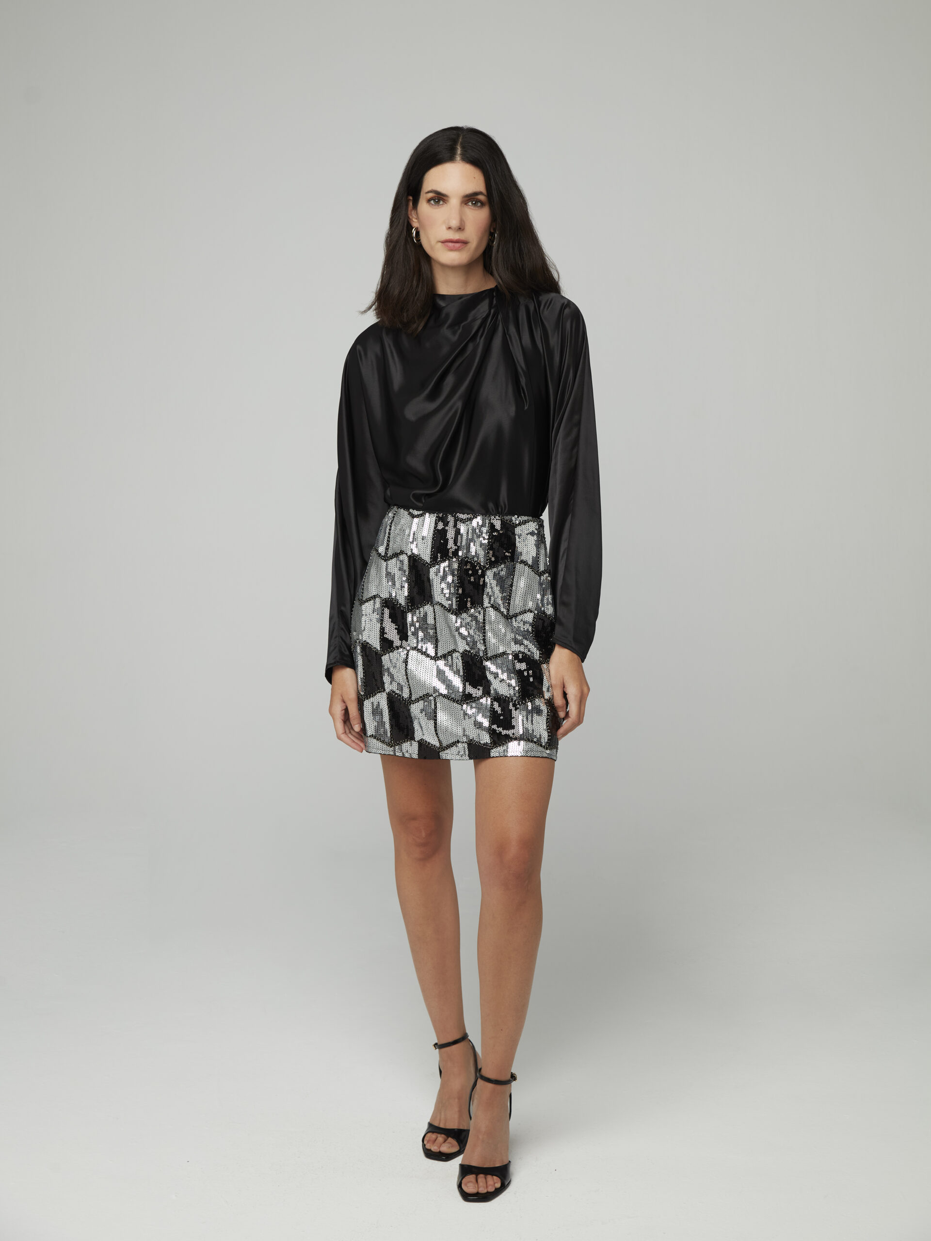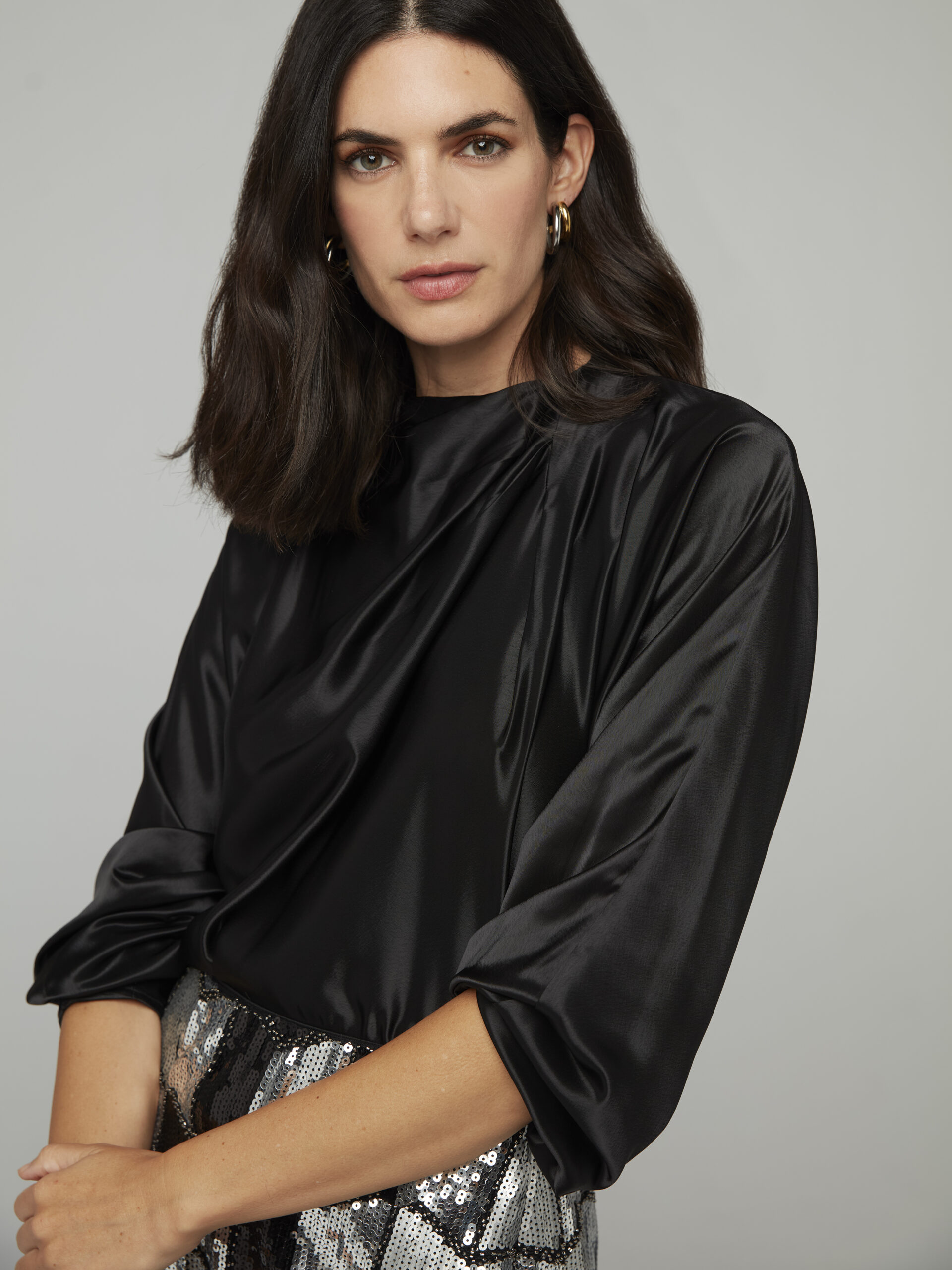 Cuerpo satinado de cuello redondo y manga japonesa semiglobo larga.