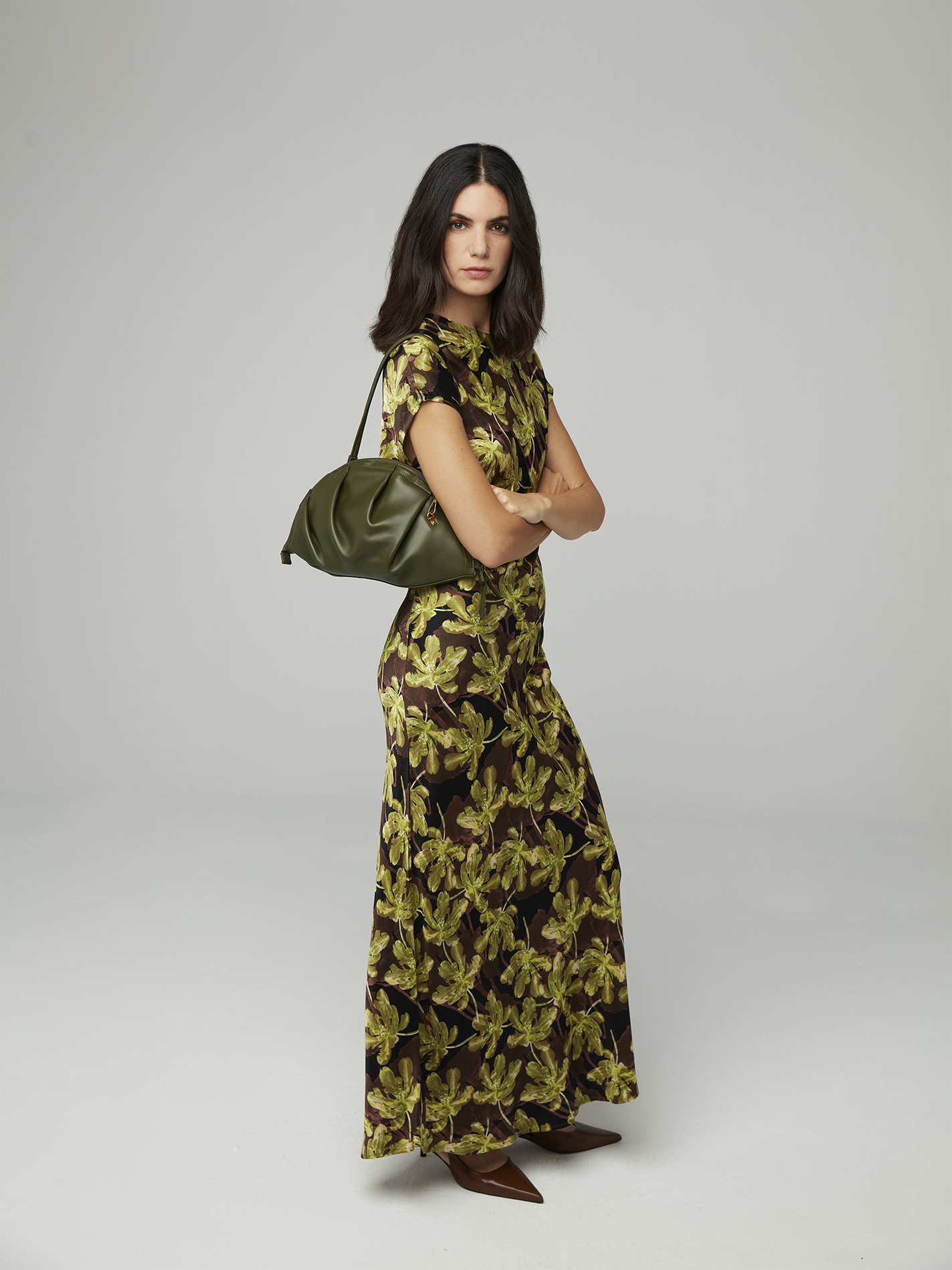 Vestido con diseño midi y corte al bies. Detalle de nudo drapeado en la cintura,